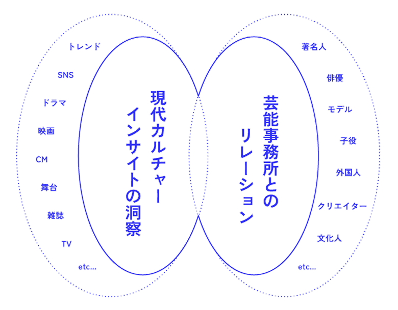 同時に多種多様な芸能事務所の知識を豊富にストックしており、日々案件の中で各社とのリレーションを築いているのも強みです。noteやPodcastを通した発信も積極的に行ない、最新トレンドのアップデートに日々努めています。